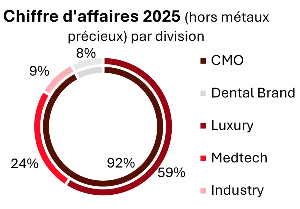 L’année 2025 a poursuivi sa tendance baissière, avec un recul plus marqué que prévu dans la division Luxury, tandis que les divisions Medtech et Industrie ont respectivement progressé et rebondi. Les ventes de la marque dentaire ont été pénalisées par la hausse des prix des métaux précieux, les droits de douane américains et la liquidation de ses filiales.