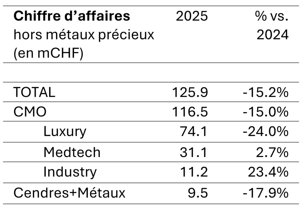 Le chiffre d’affaires hors métaux précieux a reculé de –15,2 % en 2025. L’EBITDA publié (« bénéfice avant intérêts, impôts et amortissements ») est passé de 22,3 mCHF (9,9 %) à 51,6 mCHF (22,2 %), porté par des ajustements de valeur liés à la hausse des prix des métaux précieux.